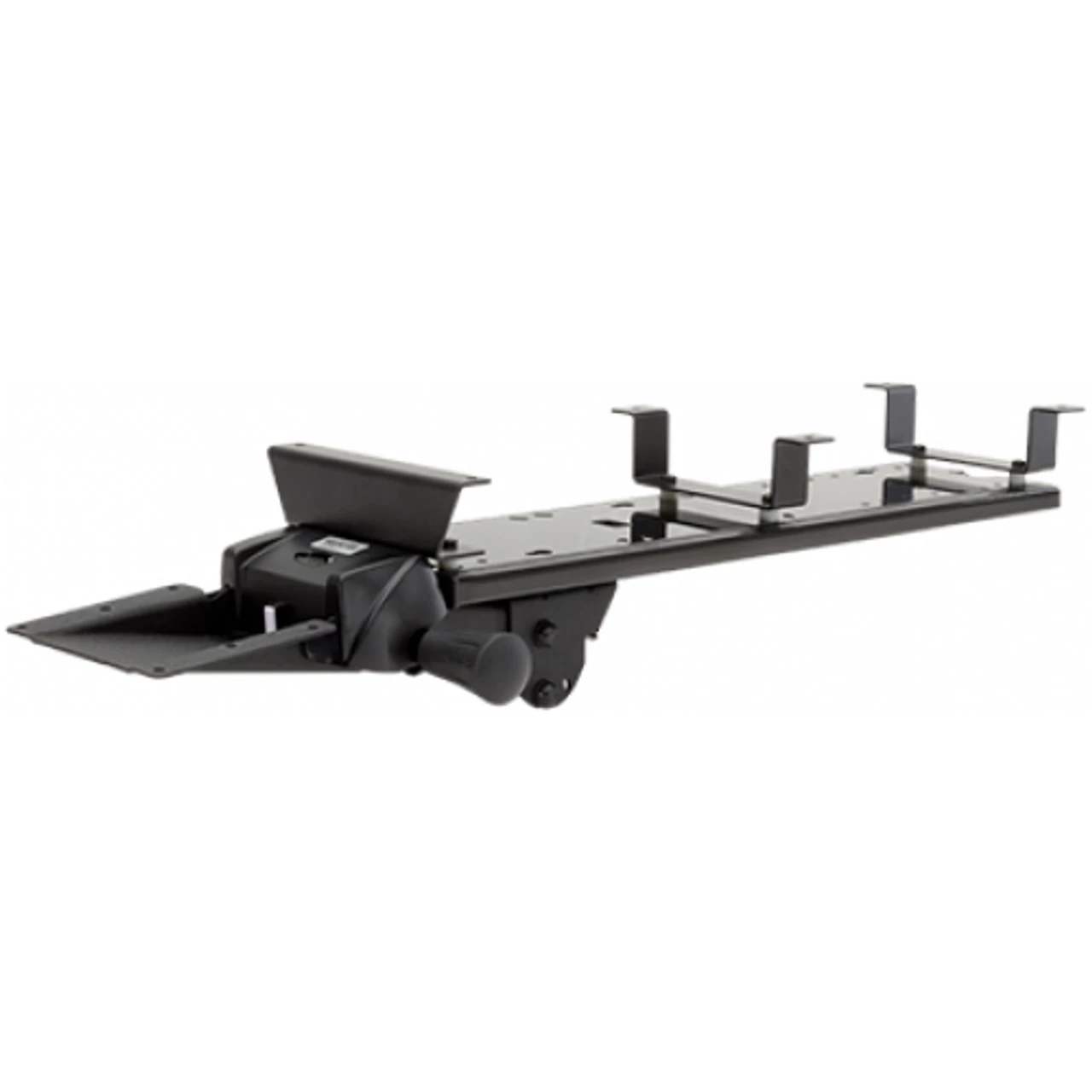 - Attaches between underside of worksurface and keyboard arm